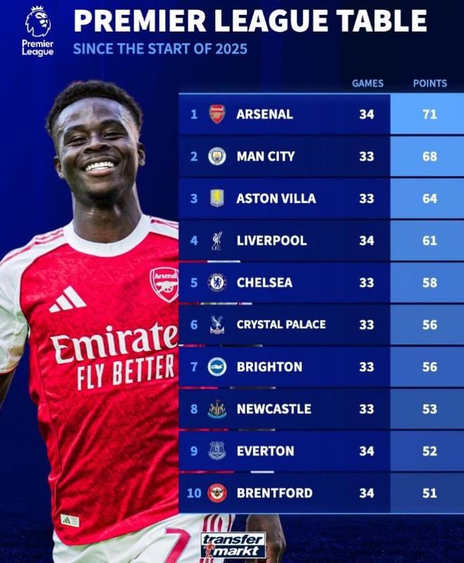 《转会市场》统计了2025年英超总积分情况,阿森纳多赛1场力压曼城居首的。