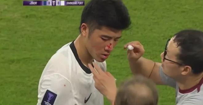 第16分钟,李圣龙倒地时被格劳德尔踢到脸上,满脸都是血。