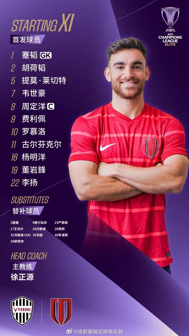 成都蓉城首发:1-蹇韬、2-胡荷韬、19-董岩鋒、22-李扬、5-提莫-莱切特、11-古尔芬克尔、16-杨明洋、8-周定洋、7-韦世豪、10-罗慕洛、9-费利佩;